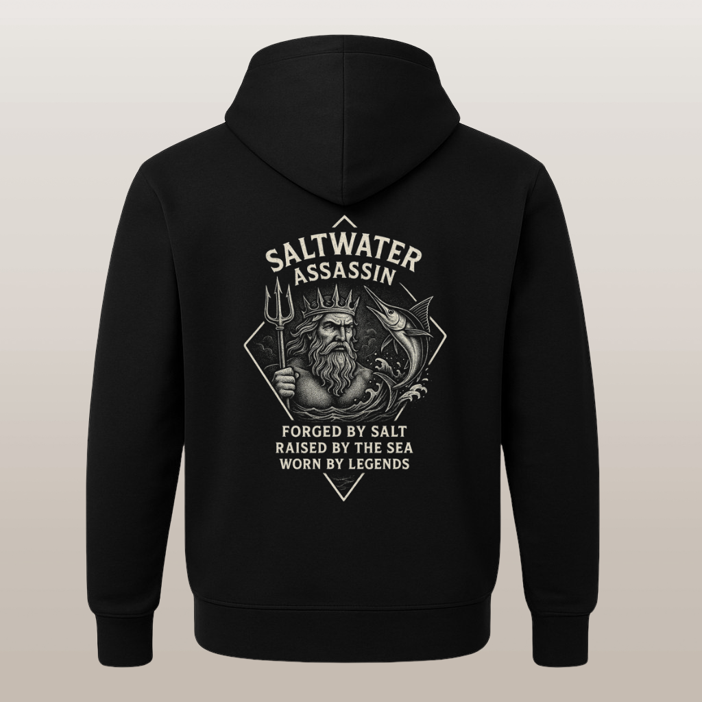 This heavyweight hoodie is more than apparel—it’s a statement. Featuring our signature Saltwater Assassin Poseidon design, this piece embodies the power of the ocean and the spirit of those born to conquer it. Built for the bold, the weathered, and the unstoppable, it’s made for life on the water—and wherever your legend grows.